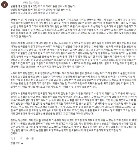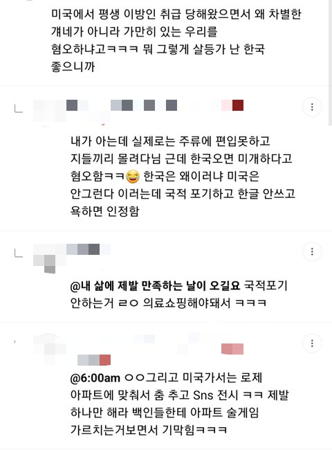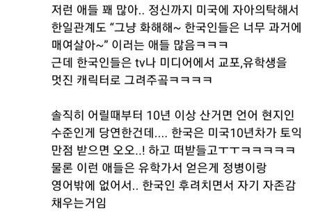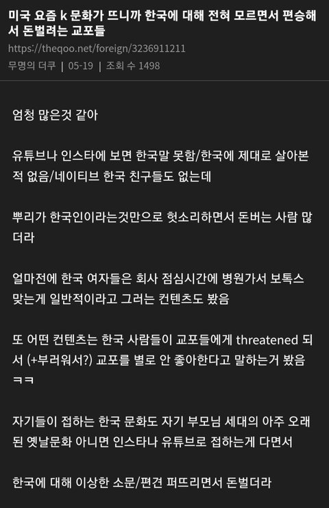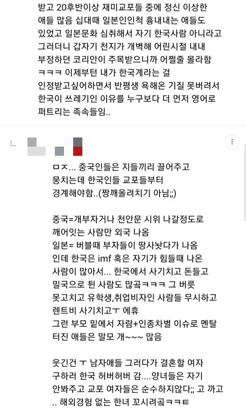 그뿐만 아니라 한류 뜨기전에 이민자 한인 상대로 사기치는 교포들, 뒤늦게 이민 온 한인들 따돌리는 교포들, 한인 영어발음이랑 영어실력 조롱하는 교포들, 한식 싫다면서 혐한하고 일빠짓했으면서 한류뜨니깐 갑자기 원래부터 한국인 정체성 있던척하면서 한식먹고, 한식 요리하고, 한국여행등 한국문화 컨텐츠 올리는 교포들 개많음