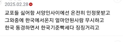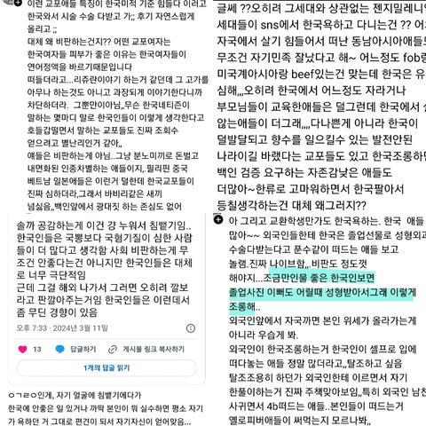 교포들 실체 밝히는글이지만 한국인들 나서서 외국인앞에서 한국까지 좀 마 한국사회, 한국단점 나도 짜증나지만 굳이 욕하고 다니지않음 위에 있듯이 나라이미지가 중요하고 한류 요즘 핫해가지고 그 덕분에 한국인이면 이득보는거 많음 그렇지만 그만큼 한국까려는 외국인들도 많음 한국이 아시아국가 ㅈㅇㅇ임 안그래도 한국에 열폭하는 외국인들 많은 거기에 먹잇감 던져주고 외국에서는 나라이미지가 중요한데 그 이미지 똥칠하고.. 교포뿐만 아니라 한국에서 자란 한국인들도 그러는데 제발 그러지 좀 마 선진국 아닌 국가들도 지들 나라 그렇게 안까고 다니고 오히려 자기나라 최고라고 하는데 한국인들만 국까짓 너무 심함 국뽕을 하라는건 아니지만 적어도 나서서 국까짓은 하지마셈 외국에선 나라이미지 중요한데 멍청한 한남한녀 검머외년놈들이 국까짓하면서 이미지 망치고있음