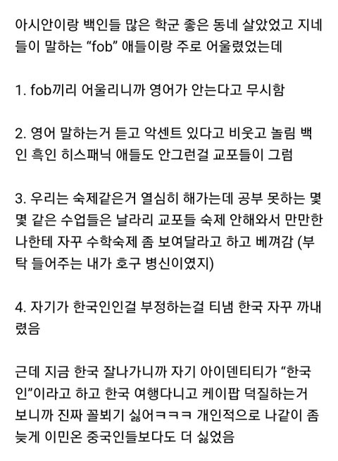 한인이 교포들한테 당한짓/ 한국에서 태어나고 이민 간 한인들 피셜 백인,흑인들보다 아시안 교포들이 영어발음 지적하고 발음조롱했고 더 괴롭혔다고함 웃긴건 지들도 백인흑인한테 무시받고 도시락에 김밥 싸가면 냄새때문에 눈치주고 놀려서 도시락에 대한 트라우마도 있는 인종차별피해자인데 그 피해자 취급도 못받고 자랐으면서 그 화를 이민자 한인 무시하고 조롱하면서 푸는 한국계 교포들이 많다고함 (주로 미국,캐나다, 호주,뉴질랜드가 심하다함)