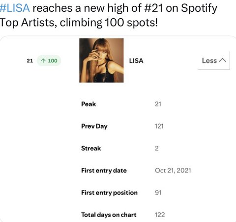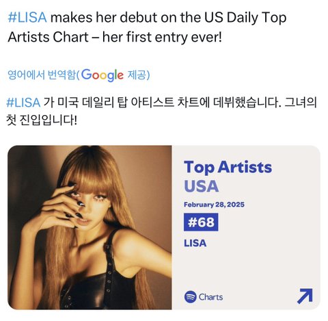 리사 미국 데일리 아티스트 차트 첨으로 진입했넹
