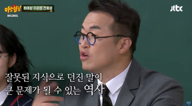한국사 일타강사 최태성. JTBC 예능 '아는 형님' 영상 캡처이를 접한 강호동이 "역사에 관심 있는 방송인들이 진짜 많다"고 묻자, 최태성은 "효성이는 연예인 중에서도 초창기에 한능검을 도전한 사례"라며 "사실 요즘 연예인들이 세상 가장 무서운 말 할 때가 언제냐면 역사 이야기할 때"라고 답했다.