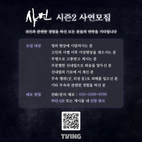 안녕하세요.TVING 오리지널 다큐멘터리 <샤먼> 시즌2를 시작합니다.​<샤먼>시즌2에서 귀신과 관련한 경험을 하신 모든 분들의 연락을 기다립니다.본인 제보, 주변인 제보 모두 가능합니다.​[모집 대상]- 사고를 당한 가족이 자꾸 꿈에 나타나는 분- 이사나 이장 후 집안에 우환이 끊이지 않는 분- 신병으로 고통받고 계신 분​- 본인 혹은 가족 중 빙의 현상에 시달리시는 분- 이상한 꿈을 꾸거나 행동을 하게 되는 분- 영혼결혼식이 필요하신 분- 고인과 사별 이후 이상 현상을 겪으시는 분- 무분별한 신내림으로 고통받으시는 분​- 무병으로 고통받고 계시는 분- 신내림의 기로에 서 계시는 분 - 무속 행위(굿, 치성 등)로 피해를 입으신 분- 기타 무속과 관련된 경험을 하신 분​[제보 방법]1) 사연 제보 링크https://forms.gle/8hGtQ7n6biHfHEjW8