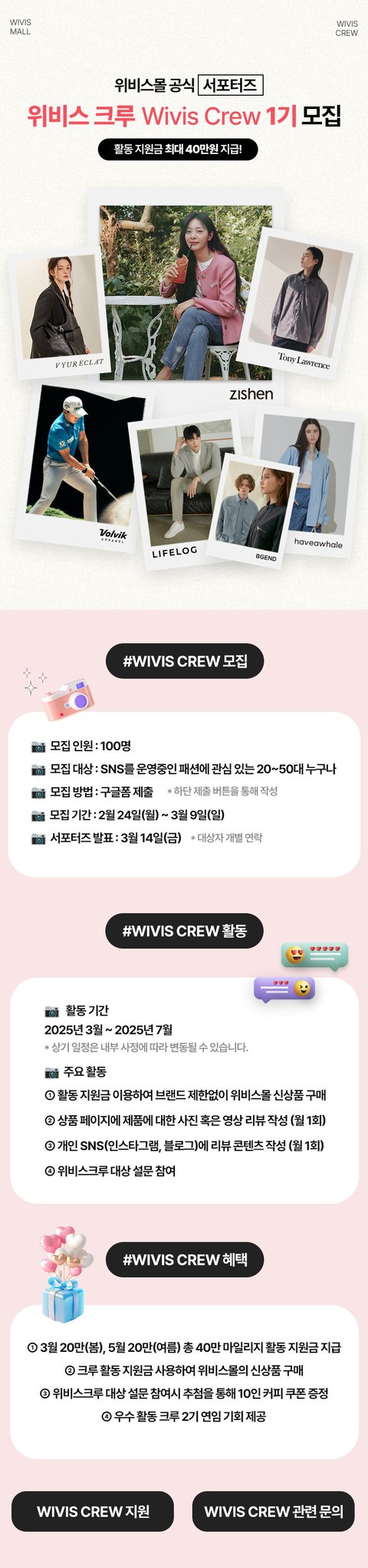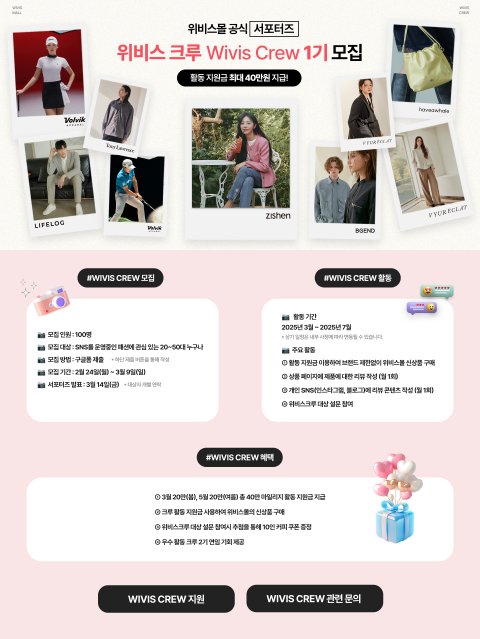 패션계 운영하면 모두 주목!!!!!!위비스몰 서포터즈 모집한다는데 활동비 40만원이고 지원금 이용해서 아무 브랜드나 옷 다 살 수 있다고 함 ㅇㅇㅇ한달에 그냥 sns에 리뷰 올리면 끝임3/9일 마감이고 구글폼으로 신청가능함 개꿀!! 서폿이라 공익 목적으로 공유함