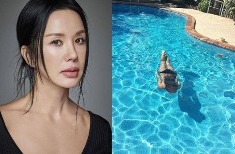 공개된 사진에는 수영 중인 엄정화가 담겼다. 우월한 수영 실력과 더불어, 군살을 찾아볼 수 없는 블랙 비키니 자태가 감탄을 자아냈다.