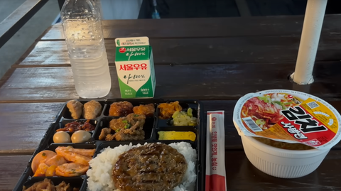 넌 혼자 느긋하게 여유를 즐기며 도시락과 컵라면을 먹으려고 준비중..