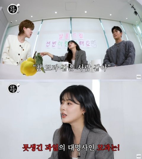 이선빈은 “어느 날 강태오가 ‘너는 과일로 따지면 참 모과 같은 사람인 것 같다’고 하더라. 네이버에 모과를 검색해봤는데 ‘과일전 망신은 모과가 시킨다’는 말이 있을 정도로 못생긴 과일의 대명사라고 나오더라. ‘이런 식으로 디스를 하는구나’라고 했다”고 토로했다.