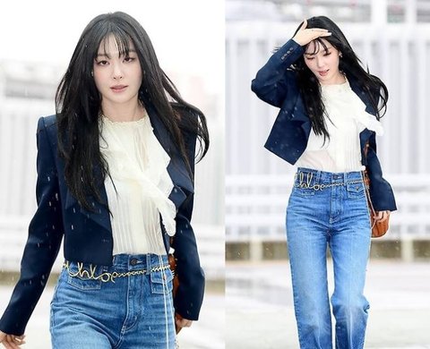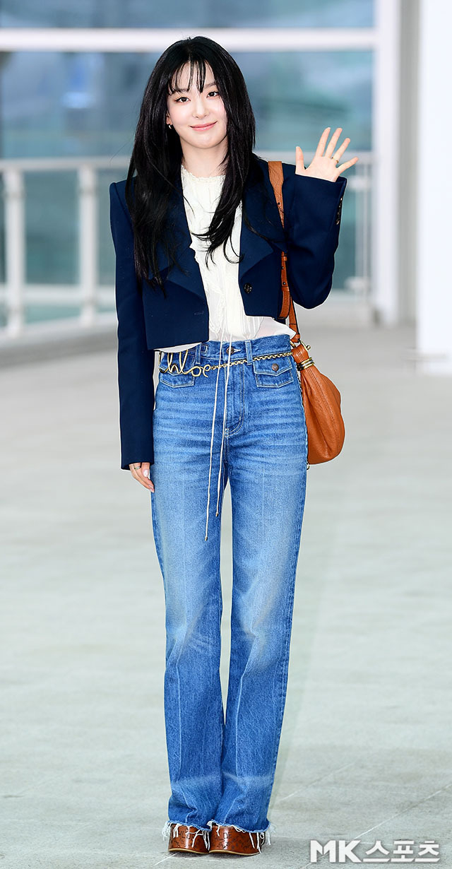 슬기는 해외 일정차 4일 오전 인천국제공항을 통해 프랑스 파리로 출국했다. 사진=김영구 기자네이비 크롭 재킷과 빈티지한 워싱 데님 팬츠를 매치해 클래식하면서도 트렌디한 스타일링을 완성했다. 여기에 우아한 레이스 블라우스를 더해 페미닌한 분위기를 강조하며, 골드 체인 벨트로 포인트를 주어 세련된 감각을 살렸다.또한 브라운 가죽 백과 웨스턴 부츠를 매치해 빈티지한 감성을 극대화했다. 자연스럽게 흩날리는 웨이브 헤어와 투명한 메이크업이 청순한 분위기를 완성하며 슬기만의 우아한 스타일이 돋보였다.