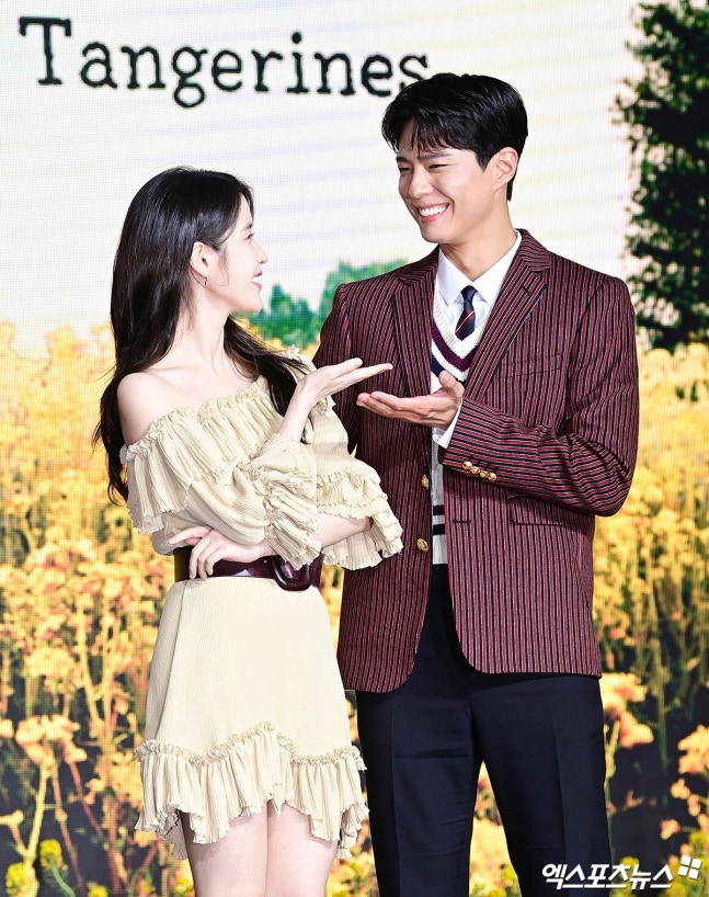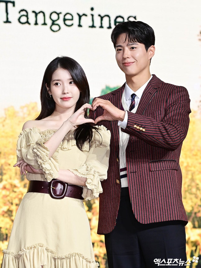 이날 제작발표회에 참석한 가수 겸 배우 아이유와 박보검이 포토타임을 갖고 있다.