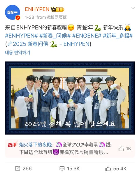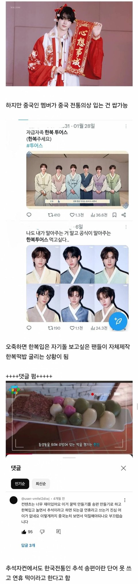 아이돌들 한복 입은거 공식 웨이보에 잘만 올리고 뭐라하는 중국팬들 없음...(한국인들 생각보다 중국인들은 한복에 관심이 없음) 투어스가 한복을 입든말든 중국팬들은 신경 안쓸텐데 소속사가 괜히 안봐도 될 눈치 보느라 이럼