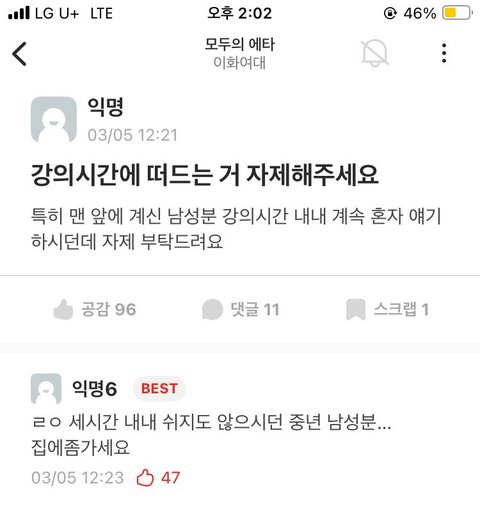여자들만 있는 에타면 공학 에타보다 재밌을듯ㅋㅋㅋ 공학 에타는 인셀남들 헛소리 밖에 없음. 현실에선 여자 손도 못 잡아본 찐따들이 에타에서는 알파남 행세하는 거 꼴보기 싫음ㅋㅋㅋㅋ