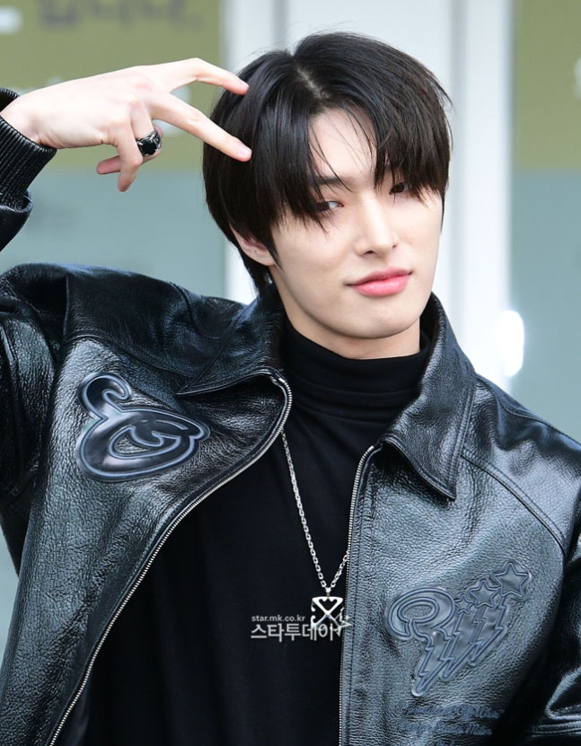 이날 민기는 검은색 가죽 재킷과 블랙 팬츠를 매치해 올블랙 스타일을 연출했다. 특히 독특한 패턴 장식이 있는 재킷으로 포인트를 더했다.
