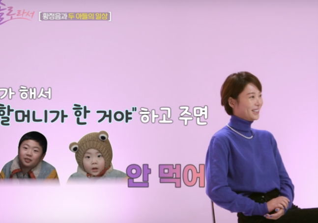 이때, 주방에서 누군가 육아를 도왔다. 알고보니 친정어머니였다.황정음은 “엄마랑 같이 산다”며 “엄마가 안 사람, 집에서 아이들을 케어하고 집안 살림을 도맡아해준다. 난 일을 열심히해서 경제를 담당하는 바깥 사람”이라 했다. “이 외에도 8년 간 도와주는 이모님이 있다”고 말했다.