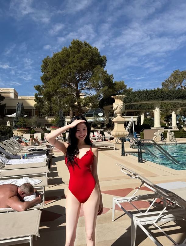 미국 라스베이거스에서의 한 호텔 수영장에서 이유비는 빨간색 수영복을 입고 다양한 포즈를 취했다.