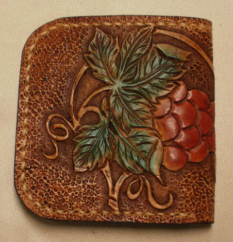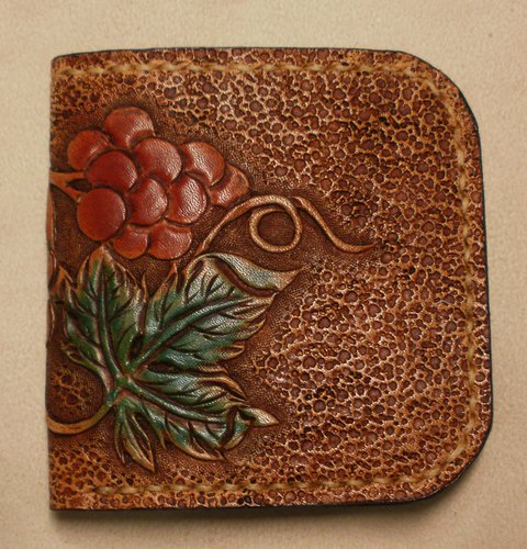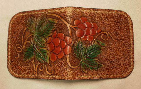 가죽에 포도 디자인을 카빙하고 천연 염색하여 수작업으로 제작한 핸드메이드 천연 가죽 지폐용 지갑입니다.(마디샤가죽공예)
