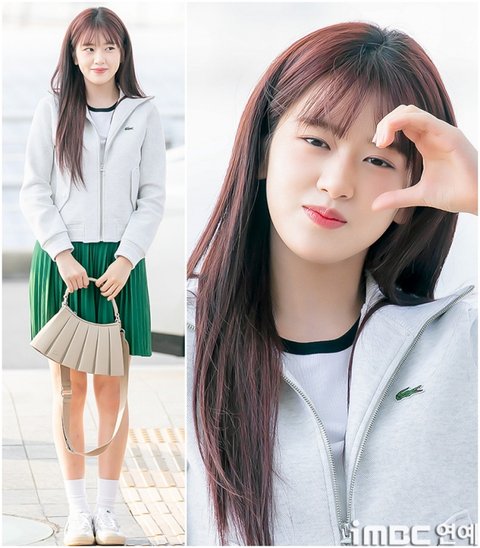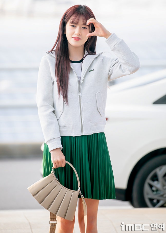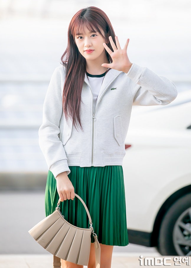 이날 안유진은 편안한 그레이 후드에 초록 스커트. 미니 베이지 백과 귀여운 양말 및 독일군 스니커즈를 매치했다. 안유진은 파리까지의 장거리 여행에 최적화된 귀여운 공항패션을 뽐내며 맑눈광을 선사했다.