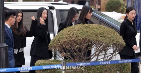 어도어가 뉴진스 멤버들을 상대로 제기한 '기획사 지위보전 및 광고계약 체결 등 금지 가처분' 첫 심문기일이 7일 오전 서울 서초구 중앙지방법원에서 열린 가운데 걸그룹 뉴진스가 출석하고 있다. 2025.03.07