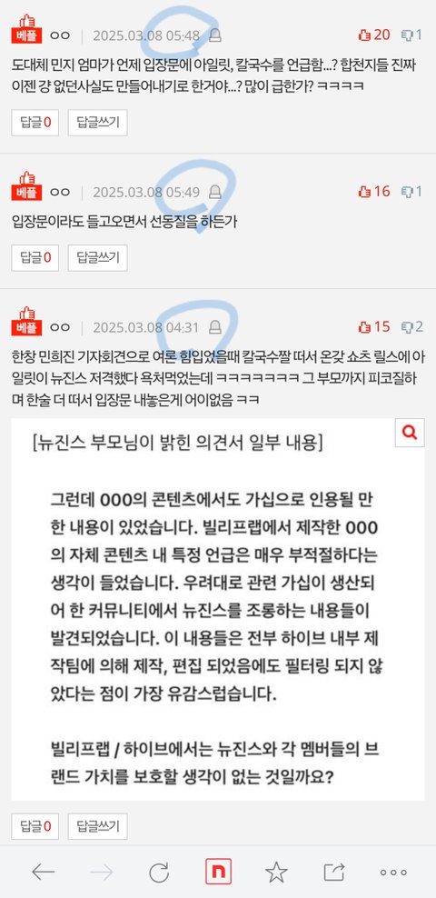 한창 민희진 기자회견으로 여론 힘입었을때 칼국수짤 떠서 온갖 쇼츠 릴스에 아일릿이 뉴진스 저격했다 욕처먹었는데 ㅋㅋㅋㅋㅋㅋㅋ 그 부모까지 피코질하며 한술 더 떠서 입장문 내놓은게 어이없음 ㅋㅋ