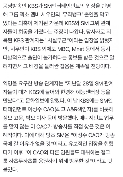 시우민 KBS 출연 거부됨 -> kbs + SM 고위관계자들이 만남 가졌다는 제보 -> KBS측 사실 무근이다 시전 ->SM은 새 그룹 하투하 응원 목적이었다 시전