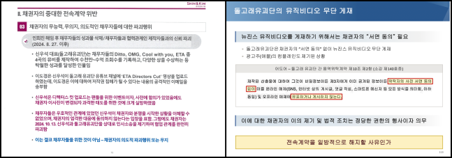 어도어: 어도어-돌고래유괴단 간 용역위탁계약 제 10조 제2항에는 '산출물에 대해 사전 서면 동의 없이 유포하거나 게시하지 않는다'고 명시 되어있다. 즉, 어도어의 서면 동의 없이 뮤직비디오를 무단으로 게재하고 멤버들의 초상권을 사용한 것. 특히 광고주(애플)의 컴플레인도 제기된 상황이었다. 법적 조치는 당사의 정당한 권한 행사이자 의무다.