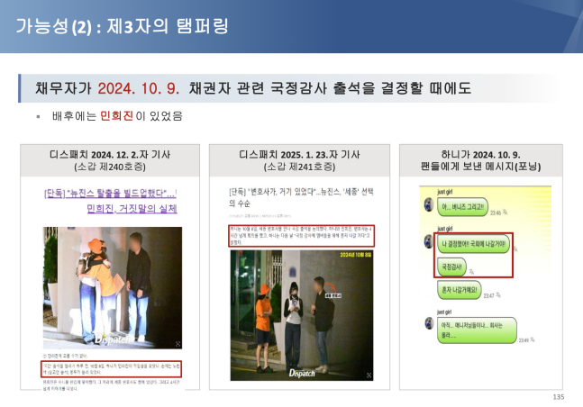 어도어: 민희진은 2024년 3월부터 뉴진스를 데리고 나올 것을 계획했다. 민희진은 뒤에 숨고, 부모님들을 내세워 하이브 측에 항의 메일을 보냈다. 계약 파기를 위한 명분 만들기 아닌가. 멤버들의 유튜브 라이브도 배후에는 민희진이 있었다. 하니가 국정감사 출석할 때도 배후에는 민희진이 있었다. 뉴진스가 전속 계약 해지 통보를 할 때도 배후에는 민희진과 그의 법률대리인이 있었다. 이러한 템퍼링으로 민희진은 이익을 얻지만, 뉴진스는 피해를 본다.