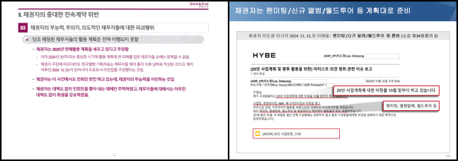 뉴진스: 당초 예정된 활동 계획을 이행하지 못했다. 어도어는 '프로듀서 바꾸면 된다'고 하지만, 프로듀싱에 대한 대안도, 업계에 대한 경험과 이해도 전혀 없었다. 2025년 활동 계획을 세우고 있다고 주장하지만, 정규앨범 기획자료는 해지 통지 이후 작성된 것이고, 해지 이후에 프로듀서 라인업을 구성한 것.
