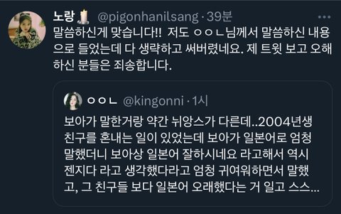저분이 저거 늬앙스 자기가 잘 못 적었다고 삭제하고 다시 글 썼는데 그건 또 빼놓지ㅋㅋㅋㅋ 애초에 보아가 귀여운썰 있다고 하면서 이야기해준건데 상관도 없는 사람들이 진지빨면서 잘못됐다고 빼액-!