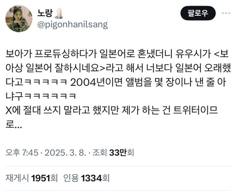 자기보다 몇십년 대선배가 혼내는데 하는 말이 “일본어 잘하시네요” 인게 ㅋㅋㅋㅋㅋ 진짜 생각회로 어떻게 되어있는지 궁금함