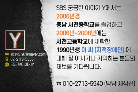 SBS 궁금한 이야기 Y에서는 2006년경 충남 서천중학교를 졸업하고2006년~2008년에는 서천고등학교에 재학한1990년생 이 씨 (지적장애인) 에 대해 잘 아시거나 기억하는 분들의 제보를 기다립니다.