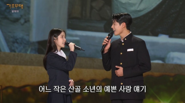 /사진='가요무대' 방송 화면한편 박보검과 아이유는 지난 10일 방송된 '가요무대' 1889회 봄맞이 편에 출연해 눈길을 끌었다. 배우들이 작품 홍보를 위해 '가요무대'에 출연하는 것은 이례적인 행보다. 중장년층이 주요 시청층인 '가요무대'에서 색다른 모습을 보여주고 싶다는 두 배우의 의견이 반영돼 성사됐다는 후문이다.두 사람은 오랜 세월에 걸쳐 대중의 사랑을 받은 예민의 '산골 소년의 사랑 이야기'를 부르며 '가요무대' 오프닝 무대를 꾸몄다. 1970년대 교복 차림으로 등장해 마치 드라마에서 갓 튀어나온 듯한 모습을 보여준 두 사람은 풋풋한 케미스트리와 마치 한 편의 시 같은 가사와 멜로디로 뭉클한 향수를 자아냈다.