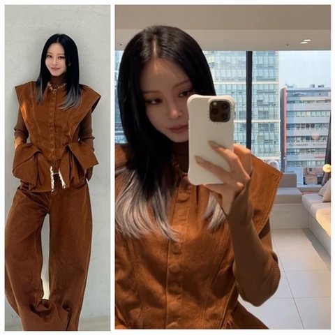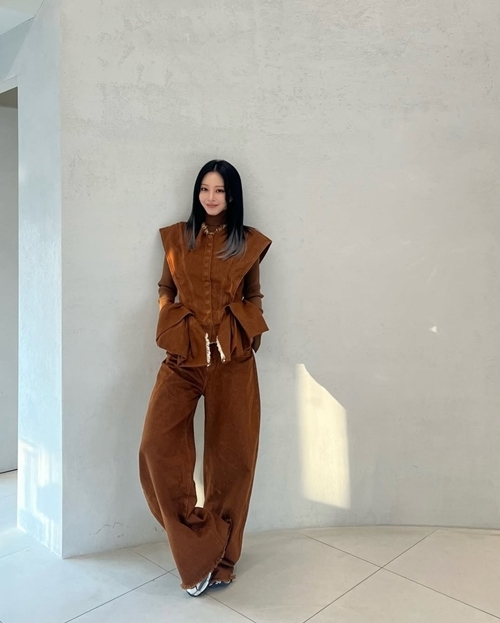 사진 속 한예슬은 카멜 브라운 컬러의 빈티지 감성 수트 셋업을 착용해 세련된 분위기를 자아냈다. 특히, 허리를 강조하는 구조적인 디자인과 어깨의 독특한 실루엣이 스타일리시한 포인트를 더했다.