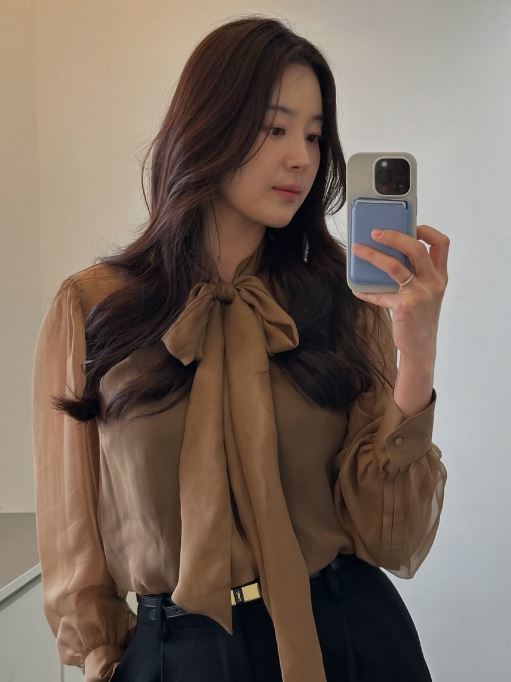 사진 속엔 한지혜의 거울 셀카가 담겨 있다. 브라운 계열의 블라우스를 입고 차분한 분위기를 풍기는 한지혜의 비주얼이 감탄을 자아낸다.