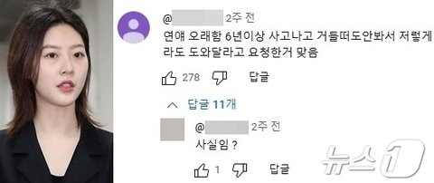 이 영상에 2주 전 댓글을 단 누리꾼 A 씨는 '빛삭 사건'에 대해 "연애 오래 함. 6년 이상 (함). 사고 나고 (김수현이) 거들떠보지도 않아서 저렇게라도 도와달라고 (도움) 요청한 거 맞음"이라고 썼다.