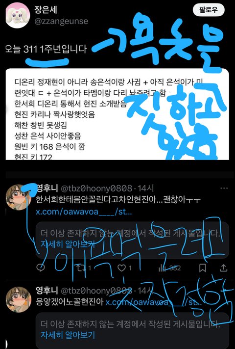 +추한 남미새 ㄱ더비들이 다른 그룹 아이돌을 욕한 잘못에 대해 계속 욕을 먹었음에도 불구하고 또 욕을 먹을려고 트위터에서 스키즈랑 라이즈를 욕하고 있는 사진이랑 추하게 구라 다 털린 한서희를 언급하면서 반감사게 나대고 있는 사진임ㅉ