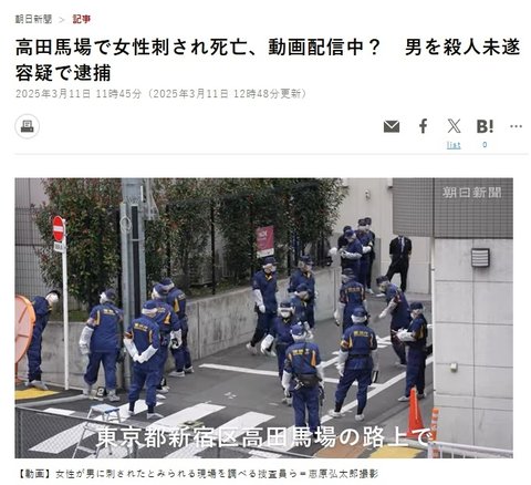 11일 일본 아사히 신문, TBS 등에 따르면 이날 오전 9시 55분쯤 도쿄 신주쿠구의 다카다노바바 거리에서 20대 여성이 흉기에 찔려 사망했다.