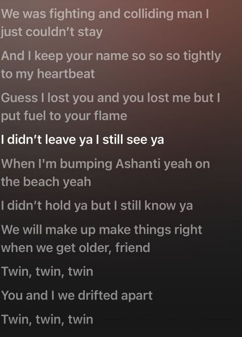 제니 '트윈' 가사./예리 소셜미디어그러면서 제니의 노래 ‘twin’의 한 구절인 ‘i didn't leave ya i still see ya (난 널 떠나지 않았어, 아직도 널 보고 있어)’를 같이 공개했다.