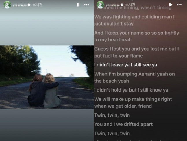 또 다른 사진에서는 블랙핑크 제니의 신곡 '트윈' 가사를 캡처했다. 특히 '난 널 떠나지 않았어, 난 아직도 널 보고 있어'(I didn't leave ya I still see ya)라는 가사를 강조했다. 이 곡은 우정을 표현한 곡으로 알려졌다.이는 평소 고 김새론과 절친으로 알려진 예리가 김새론을 추모하는 글로 보인다. 김새론 생전 예리는 그와 인도네시아 발리, 강릉 등으로 우정 여행을 떠나기도 한 것으로 알려졌다.