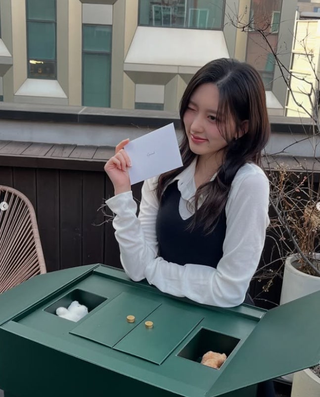 또 다른 사진에서는 흰색 셔츠에 검정색 뷔스티에를 레이어드하고, 편지 봉투를 들고 윙크를 하는 모습으로 사랑스러운 매력을 발산했다.