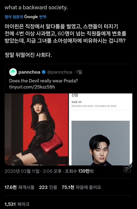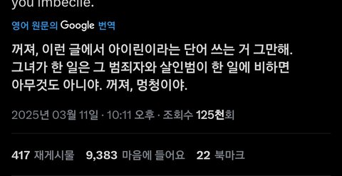 야이씨 아무리 아이린이 싫어도 인성 논란이랑 입에 담기도 싫은 저런 더러운 짓을 같은 선상에 두는 게 맞아? 갖다댈 걸 갖다대라. 지들 본진 병크 묻으려고 별 걸 다 가져오네 진짜