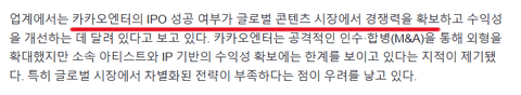 카엔 상장하려면 해외차트 차트인 하는 그룹이 나와야 함카엔의 핵심자회사 걸그룹이 지속적으로 해외 흥행곡을 샘플링 했던 것도 해외차트 차트인 - 글로벌 경쟁력을 확보하려 했던 거 앺라 이후로 번번이 실패 (하루 반짝도 실패로 보는 게 타당) 국내 언플질만 있을 뿐 실질적으로 글로벌 경쟁력을 확보한 그룹은 아직도 없는 상태