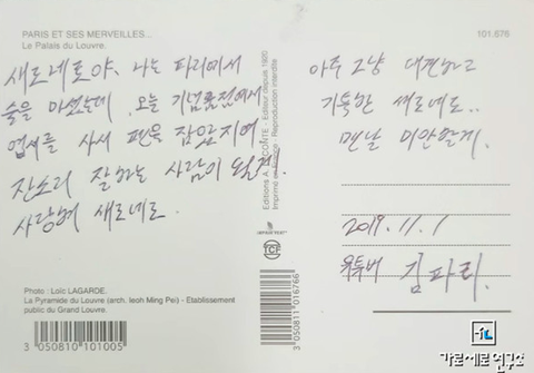 다른 편지에는 "새로네로야, 나는 파리에서 술을 마셨는데 오늘 기념품점에서 엽서를 사서 펜을 잡았어. 사랑해 새로네로"라고 적혀 있습니다.