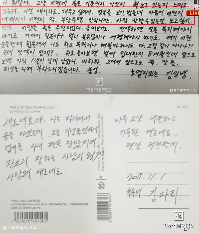 가세연은 "김수현이 김새론에게 보낸 것"이라며 엽서도 한 장 공개했다. 엽서에는 "새로네로야. 나는 파리에서 술을 마셨는데 오늘 기념품점에서 엽서를 사서 펜을 잡았다. 잔소리 잘하는 사람이 될게. 사랑해 새로네로"라는 말이 적혀 있다.