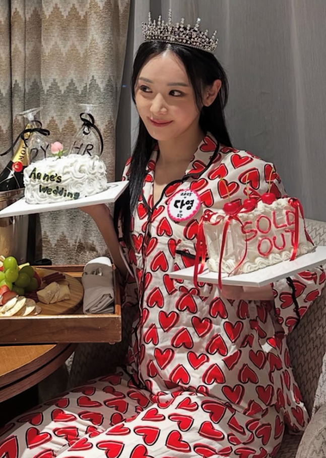 김다영 아나운서. 김다영 인스타그램.공개된 사진에서 친구와 같은 잠옷을 입은 김다영은 ‘Sold out(품절)’이 적힌 케이크를 들고 포즈를 취하기도 했다.