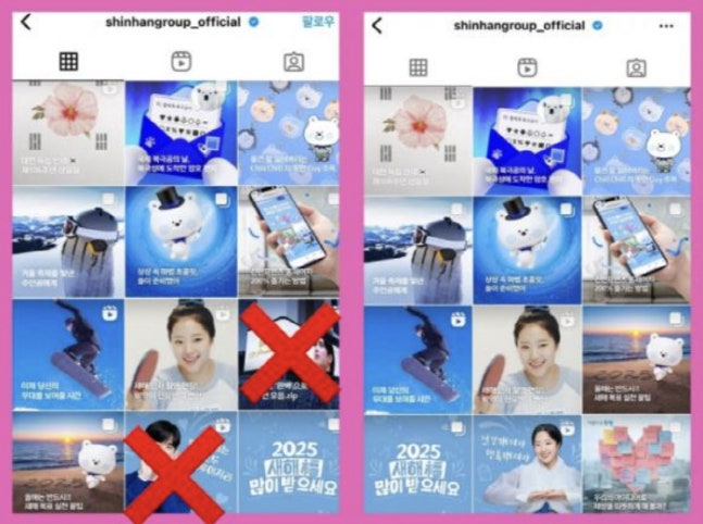 왼쪽은 기존 인스타, 오른쪽 오늘(13일) 인스타..(사진=커뮤니티)신한금융그룹은 지난해 6월 자산관리 브랜드 모델로 배우 김수현을 발탁하면서 신한금융그룹 베트남까지 그룹 브랜드 앰배서더로 기용했다. 신한금융의 그룹사 대표 모델 기용은 13년 만에 처음으로, 화제를 모은 바 있다. 김수현과 신한 프리미어 자산관리 사이에 광고 계약 기간이 아직 남아있는 상황으로 알려졌다.또한 어제까지 지켜본다던 대형 유통사 홈플러스도 어플 첫 화면에 뜨는 김수현 전신을 담은 메인 사진을 삭제한 상태다. 현재 회사 해체 위기 속에 '홈플런' 행사에 사활을 걸고 있던 홈플러스는 모델 리스크까지 겹쳐 제대로 된 홍보도 하지 못하는 상황이 됐다.
