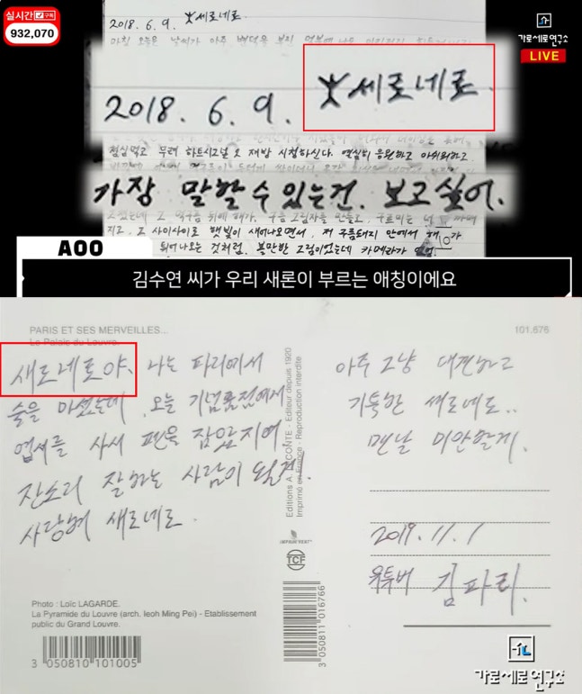 유족 주장에 따르면 '새로네로'는 김수현이 김새론에 붙여준 애칭이다. 그러면서 김새론이 김수현에게 받은 편지와 엽서를 공개했다.