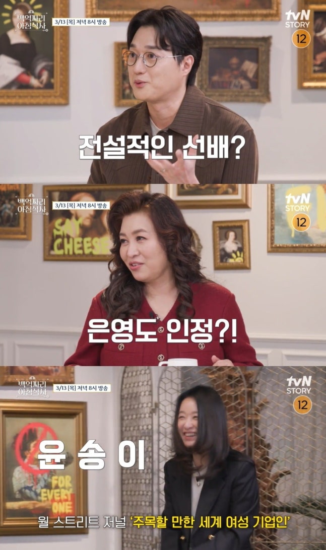 오늘(13일) 방송되는 '백억짜리 아침식사' 4회에서는 미국 내 한국인 중 최연소 박사 학위 취득, 28세 대기업 임원 발탁 등 세계 1%의 엘리트 윤송이 대표의 성공 비밀을 알아본다. 예능 프로그램 첫 출연인 윤 대표는 미국에서의 일상을 최초 공개할 예정. 그뿐만 아니라 이날은 밴드 페퍼톤스의 멤버이자 윤 대표의 카이스트 후배인 이장원이 특별 출연, '연예계 대표 뇌섹남'의 존재감을 예고해 기대감을 더한다.