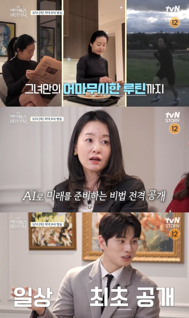 사진=tvN STORY '백억짜리 아침식사' 제공세계 IT 산업의 중심인 미국 실리콘 밸리에서 AI(인공지능) 스타트업에 투자하는 벤처 투자가로 활약 중인 윤송이 대표는 빈 틈 없는 일과를 선보인다. 새벽 5시 기상, 효율성을 중시하는 공학도답게 식사 준비, 운동으로 이어지는 모닝 루틴을 철저한 시간 관리 하에 진행한다. 이후 외부 미팅은 물론, 출장까지 완벽하게 소화하는 윤 대표를 보며 오은영 박사는 "백만 송이 열정"이라고 감탄한다.
