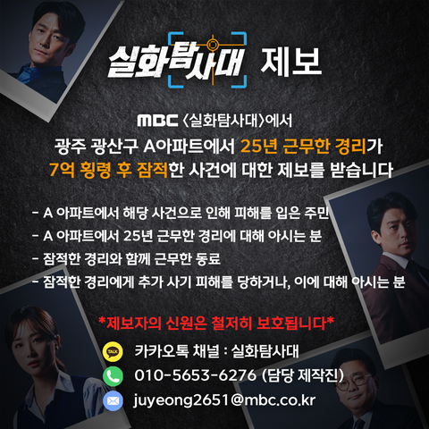 MBC <실화탐사대>에서 광주 광산구 A 아파트에서 25년 근무한 경리가 7억 횡령 후 잠적한 사건에 대한 제보를 받습니다.