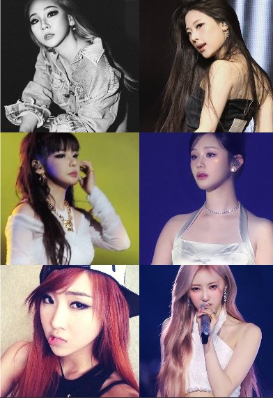 아현 = 센터메보 아사 = 메랩 치키타 = 메댄 로라 = 비주얼 반대로 이 3명은 2ne1느낌남