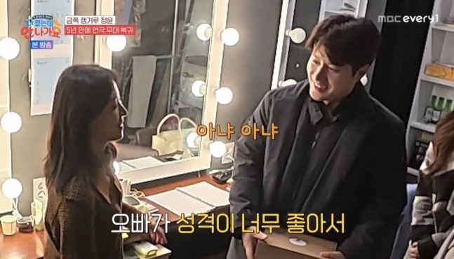 홍진경은 신정윤에게 "연기할 때 키스신 하고 나면 사람인데 (설레지 않냐)"고 물었고, 신정윤은 "정신줄을 잡느냐, 놓느냐의 차이다. 놓으면 안 된다"라고 밝혔다. 연극 리허설이 끝난 후 대기실에 찾아간 신정윤 엄마와 동생. 엄마는 상대 배우 유인을 유심히 봤다. 하하는 "아무래도 아들보단 상대 배우에게 눈길이 간다"고 했고, 지조는 "어머니의 초관심사"라고 밝혔다.