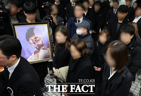 故 휘성의 발인이 16일 오전 서울 강남구 삼성서울병원의 장례식장에서 엄수된 가운데 동료 연예인들과 유가족이 참석해 고인의 마지막 길을 위로하고 있다.